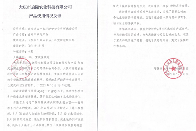 與多所高校、研究院、各大種業企業合作種植改良鹽堿地水稻。在黑龍江、吉林、內蒙古等地有多處示范基地。在新疆等地區種植草木,環(huán)境綠化等工程。幾年來,啟隆人大力弘揚“創(chuàng)新、堅韌、拼搏、開拓”的企業精神,在研發(fā)上勇攀高峰。大慶啟隆 的企業宗旨是“誠信于鹽堿地的朋友,服務于鹽堿地的朋友”,努力為鹽堿地改良做出積極的貢獻。